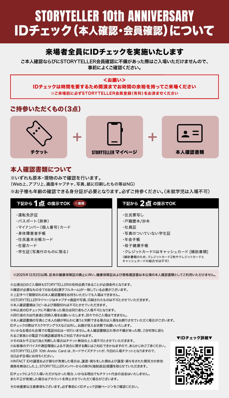 本ページの内容ならびに注意事項をお読みになった上でもIDチェックに関して不安がある場合は、事前にSTORYTELLER事務局にお問い合わせください(公演日間近の問合せは返信いたしかねる場合がございます)。